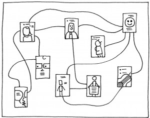4. The next task is simple: find the people you know and draw lines to make the connections. Label the lines if you can: “friends with” or “went to school with” or “went mountain climbing with.” This continues for a time and is likely to result in previously undiscovered links and new friends.